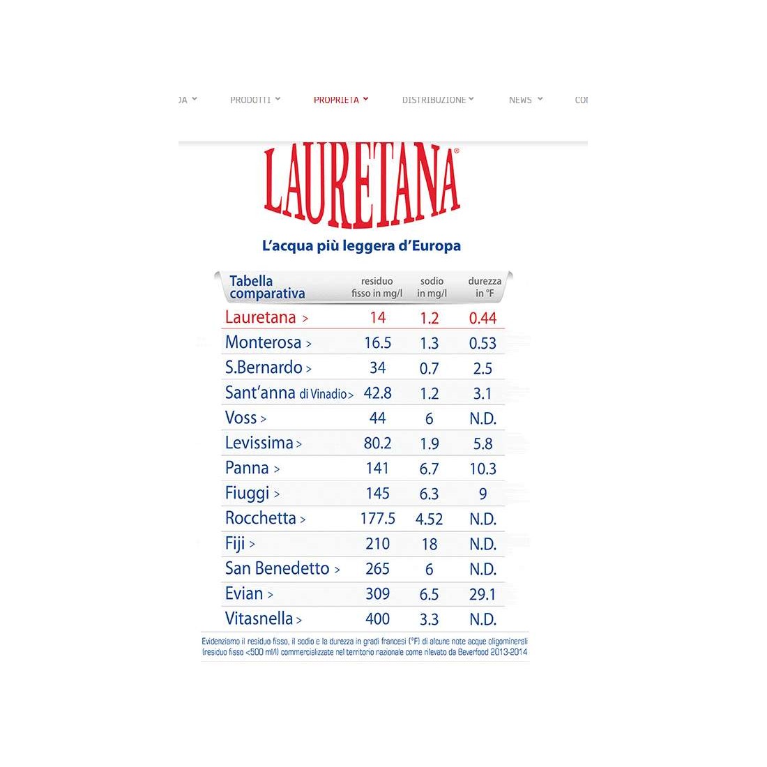 Acqua minimamente mineralizzata con residuo fisso bassissimo di soli 14 mg/l che associato al bassissimo contenuto di sodio favorisce la diuresi e il ricambio idrico. Acqua adatta ad antipasti a base di mare e dessert.